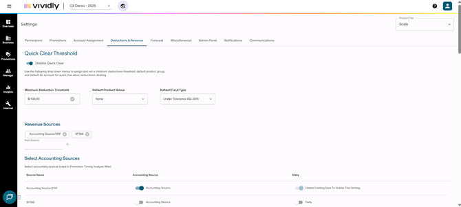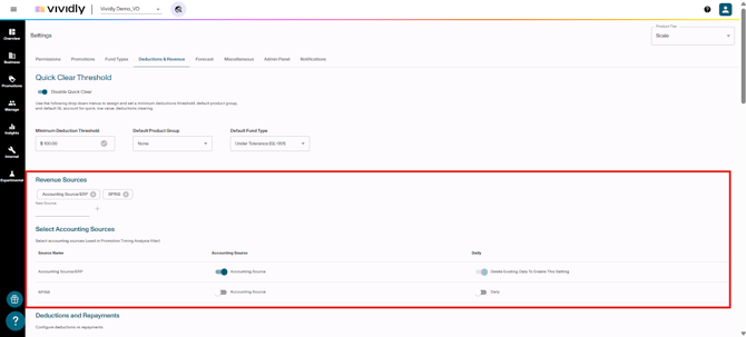 The Deductions & Revenue section manages all configuration related to deduction processing, revenue source management, and system thresholds. This is fundamental to proper deduction scanning, matching, and reconciliation processes.