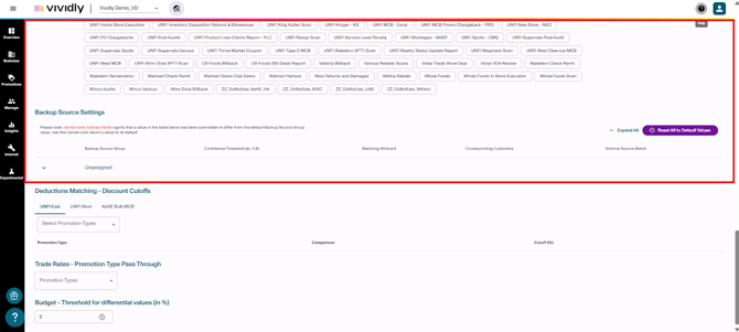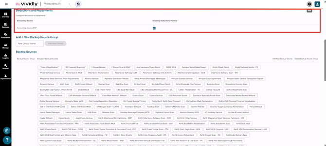 Backup Sources section: Management area for backup documentation sources from customers who submit deductions, making these sources available for Deduction Scanner and Matcher workflows.