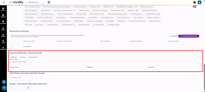 Confidence threshold columns: Used in the "Auto-Match" feature of Deductions Reconciliation. Column that sets the percentage variance allowed for spend rate matching before a match is considered "low confidence”. Invoice Lines can be matched to Promotions planned with a Spend Rate percentage or dollar rate.