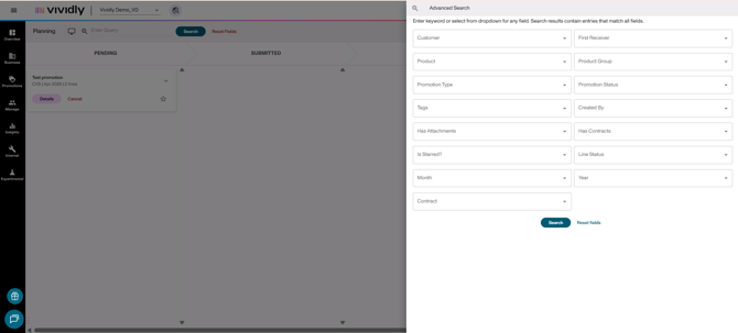 The Advanced Search feature in Vividly's Promotion Planning module is a powerful filtering tool that allows users to quickly narrow down potentially thousands of promotions to a specific subset based on multiple search criteria simultaneously. Unlike the basic text search bar—which requires exact matches and only searches promotion names or promotion line IDs—Advanced Search provides granular filters across numerous promotion attributes including customer, product group, promotion type, month and year, status, tags, attachments, and many more. This capability is essential for users who need to find specific promotions without manually scrolling through extensive promotion lists, especially in large organizations with hundreds or thousands of promotional events each year.