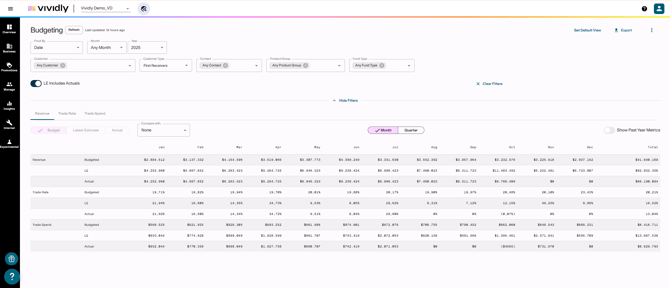 The Vividly Budget Module enables CPG brands to create accurate, bottoms-up sales budgets and track performance against planned targets. It provides comprehensive visibility into revenue performance, trade spend effectiveness, and budget vs. actual comparisons to support strategic decision-making.