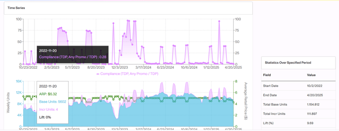 TDP Any Promo: The Total Distribution Points measurement specifically for stores that sold the product at a discounted/promotional price during the time period. This represents the distribution breadth where promotional pricing was executed. TDP Any Promo is used to calculate promotional compliance—the percentage of stores that actually ran your promotion as planned. Compliance = (TDP Any Promo ÷ TDP) × 100.
