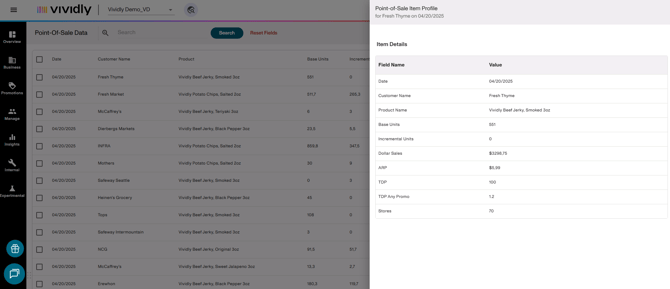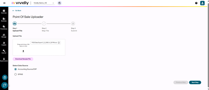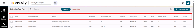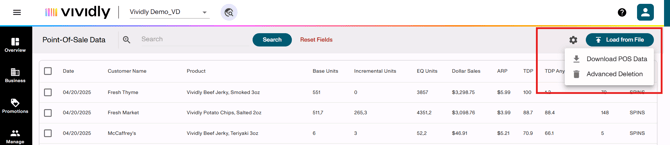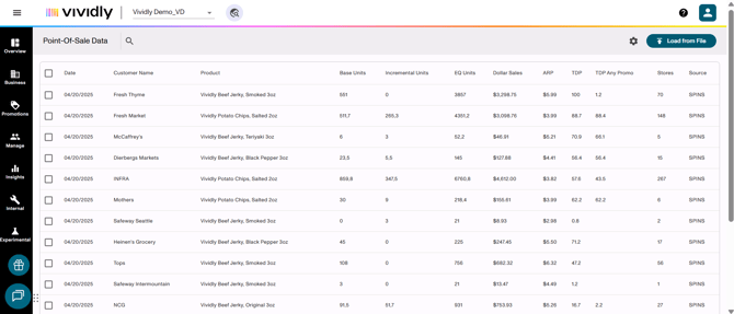 Point-of-Sale Data is Vividly's consumer purchase tracking and promotional performance analysis interface that enables CPG brands to upload, visualize, and analyze actual retail scan data (what consumers purchase at the register). Located within the Business section (accessible via Business icon in the left-side navigation menu), Point-of-Sale Data serves as the foundation for measuring promotional lift, store compliance, baseline versus incremental sales, and overall retail execution effectiveness.