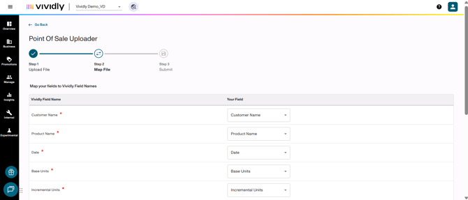 Upload field mapping interface: During upload, users confirm which columns in their Excel file correspond to required Vividly fields (Customer Name, Product, Date, Base Units, Incremental Units, Stores); system remembers previous mappings for repeat uploads from same source. There's only two columns to define here: