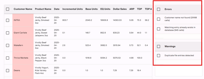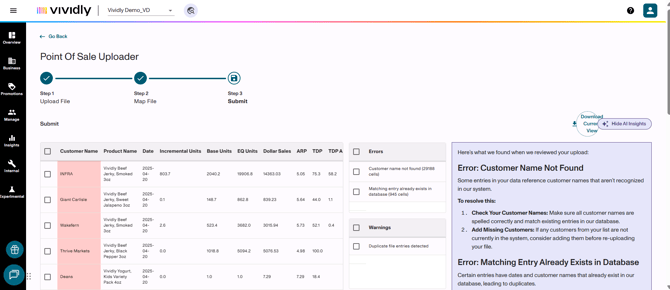"Duplicate Data" Warning: Alerts user when attempting to upload POS data that already exists for same customer-product-date combination; prevents double-counting of units and metrics. Consider deleting this data from the file before submitting it.