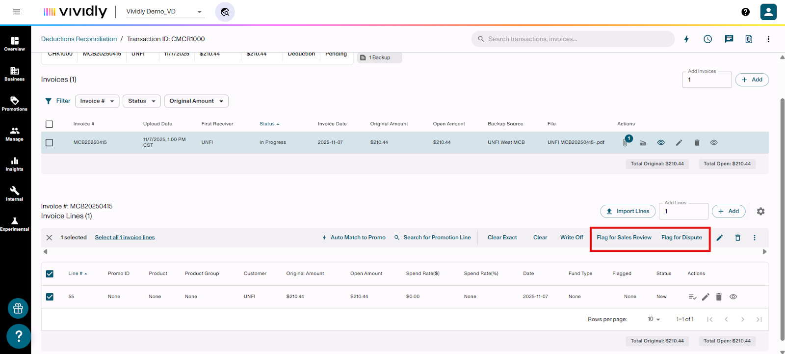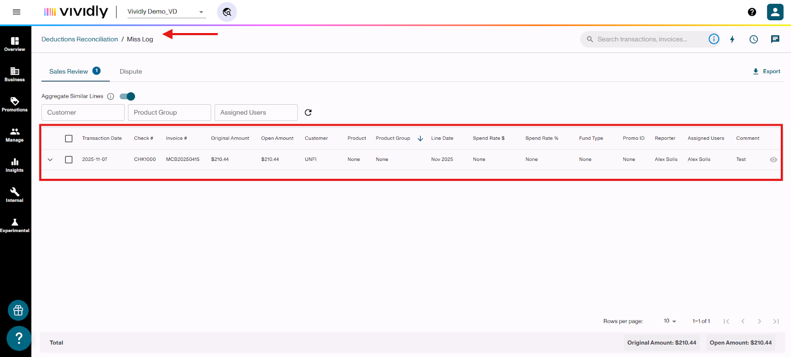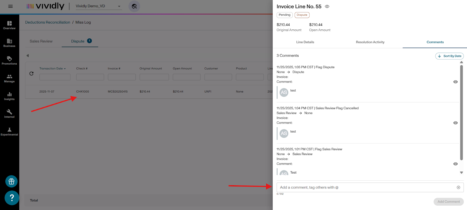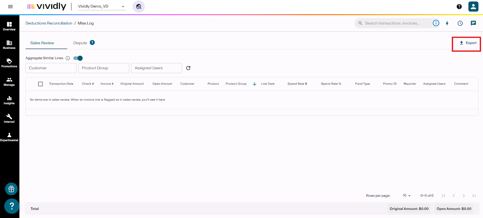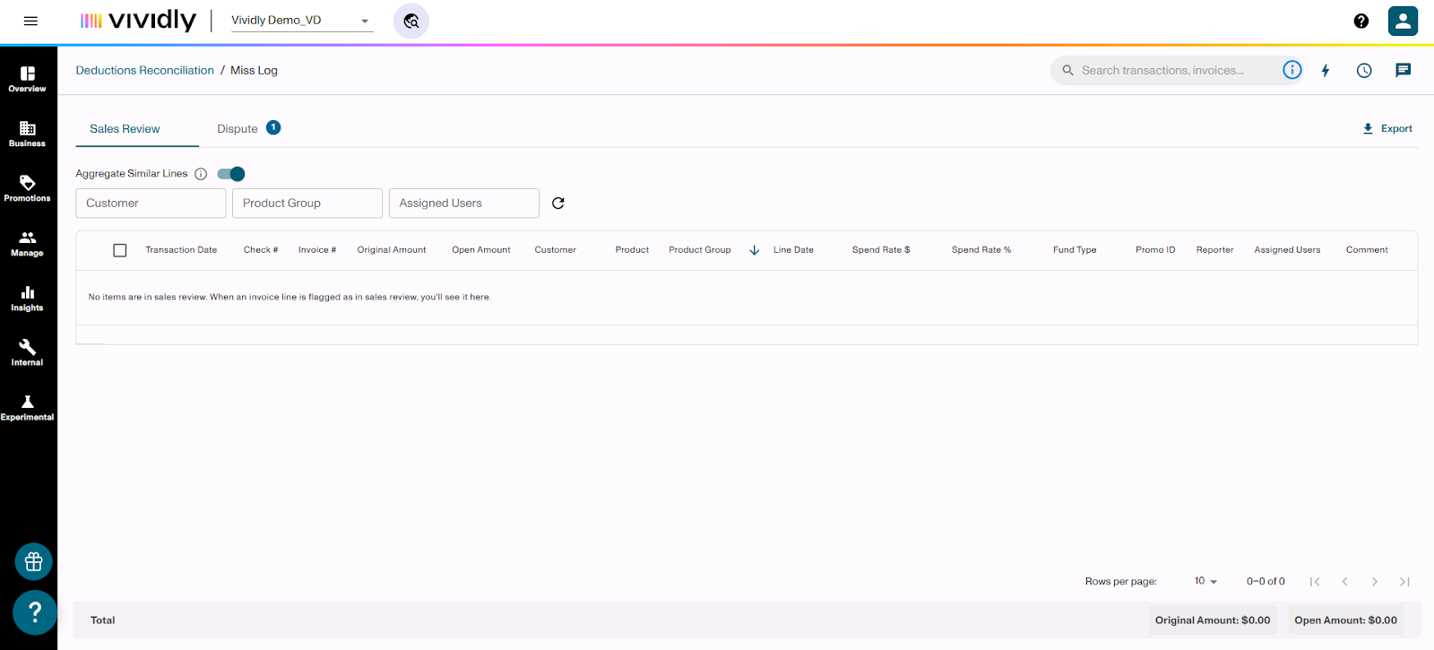 Learn how to flag invoice lines for Sales Review or Dispute when processing deductions in the Miss Log of Vividly's Deduction Reconciliation Module. These flags help you validate expenses, involve your sales team, and identify invalid deductions that need to be disputed.