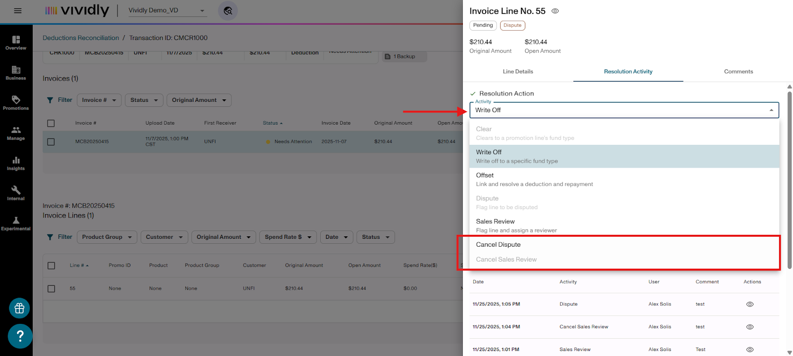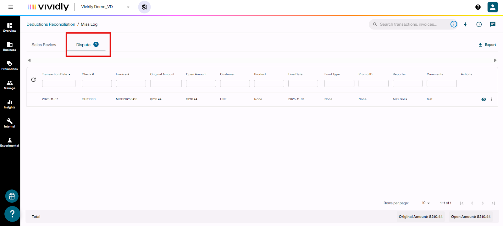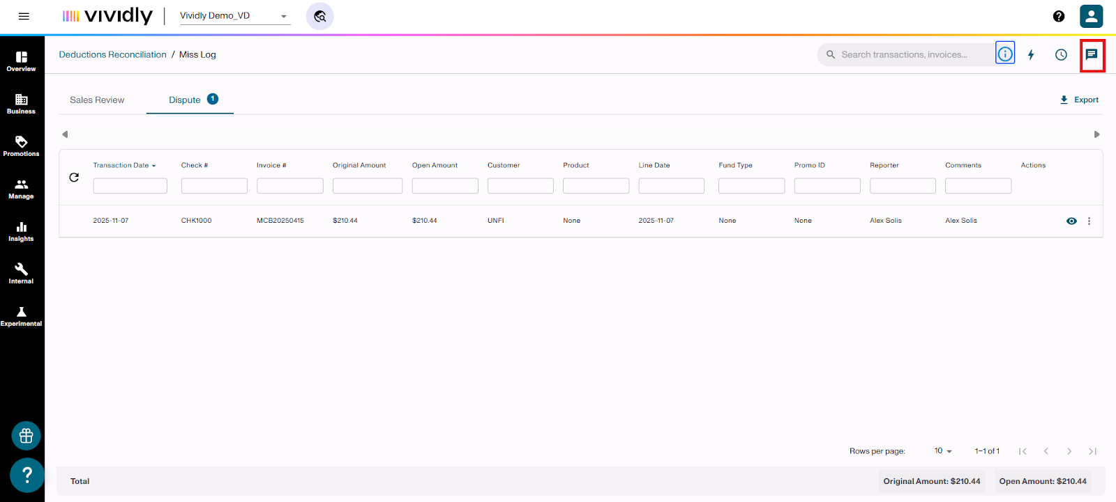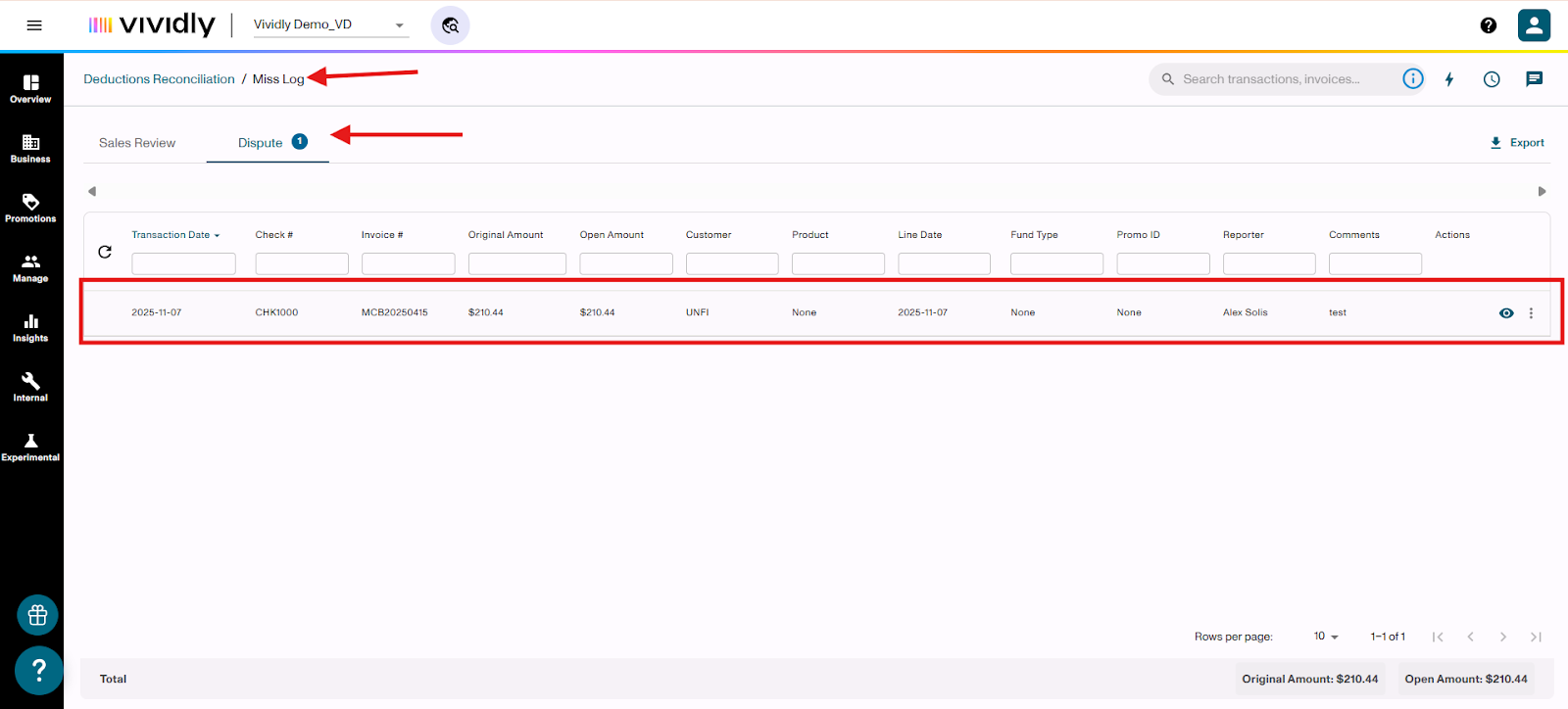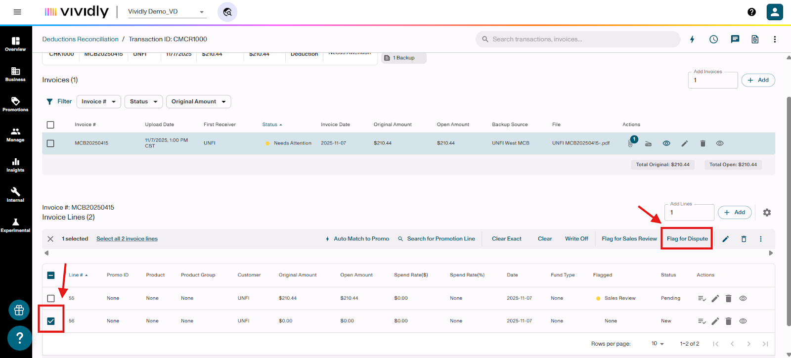 Learn how to flag invoice lines for Sales Review or Dispute when processing deductions in the Miss Log of Vividly's Deduction Reconciliation Module. These flags help you validate expenses, involve your sales team, and identify invalid deductions that need to be disputed.