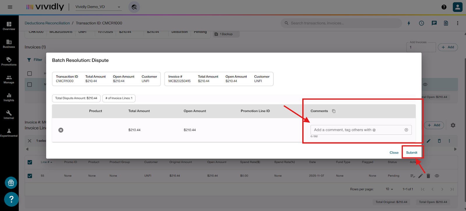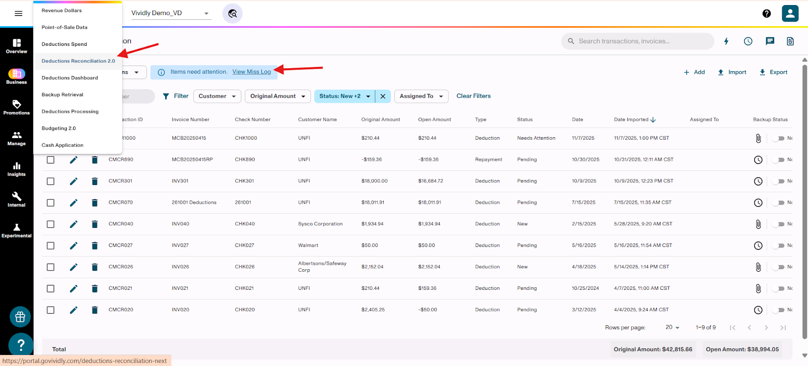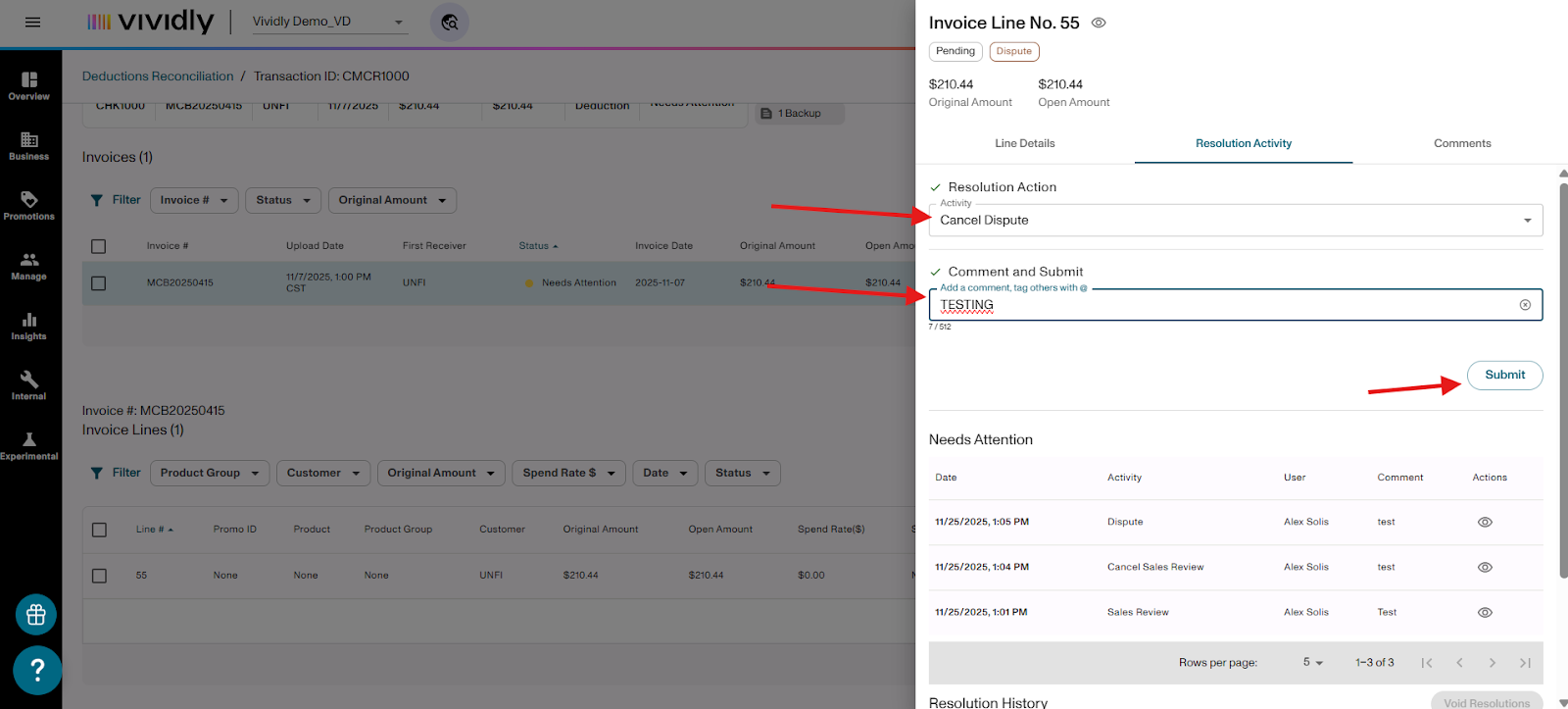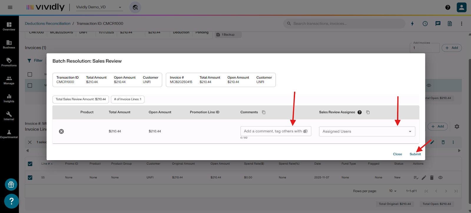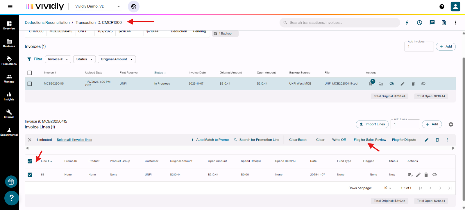 Learn how to flag invoice lines for Sales Review or Dispute when processing deductions in the Miss Log of Vividly's Deduction Reconciliation Module. These flags help you validate expenses, involve your sales team, and identify invalid deductions that need to be disputed.