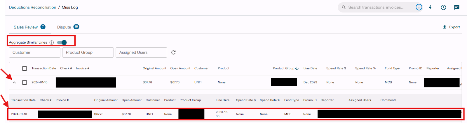 - Click on the "down caret symbol" to expand rows to see what invoice lines make up the aggregated line.