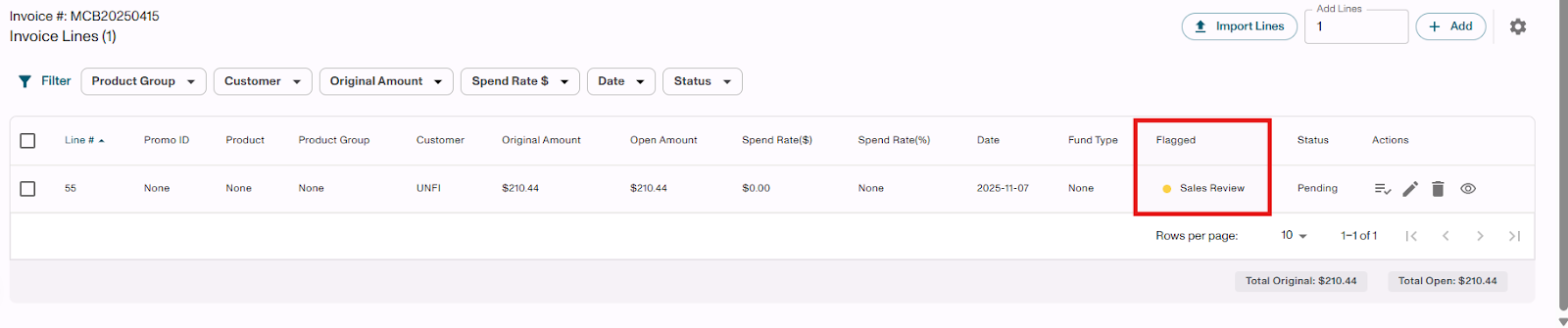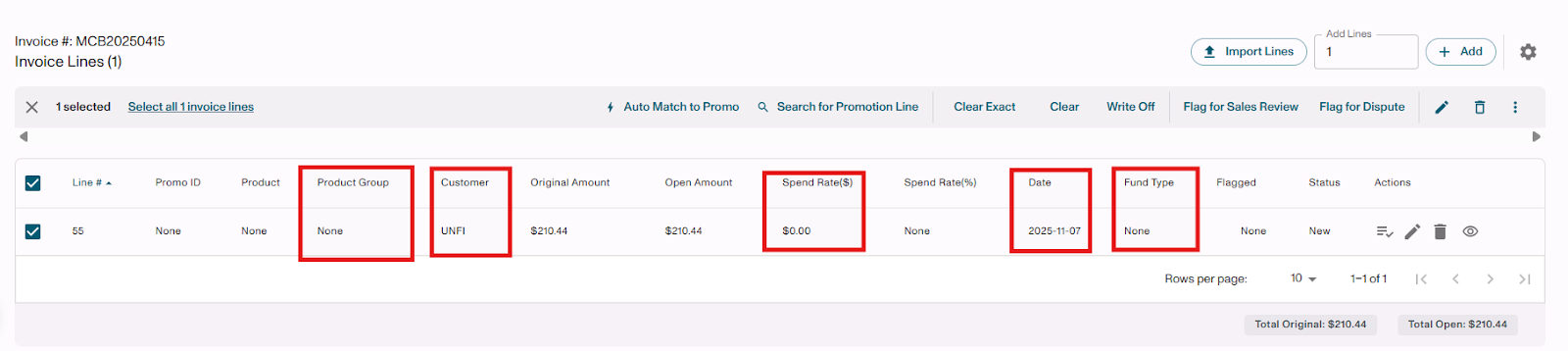 - Invoice Lines are aggregated by: Customer, Product Group, Month/Year of Line Date, Spend Rate %, Spend Rate $, and Fund Type