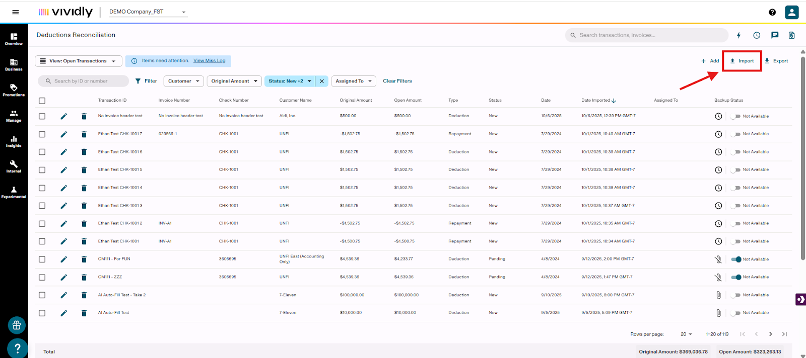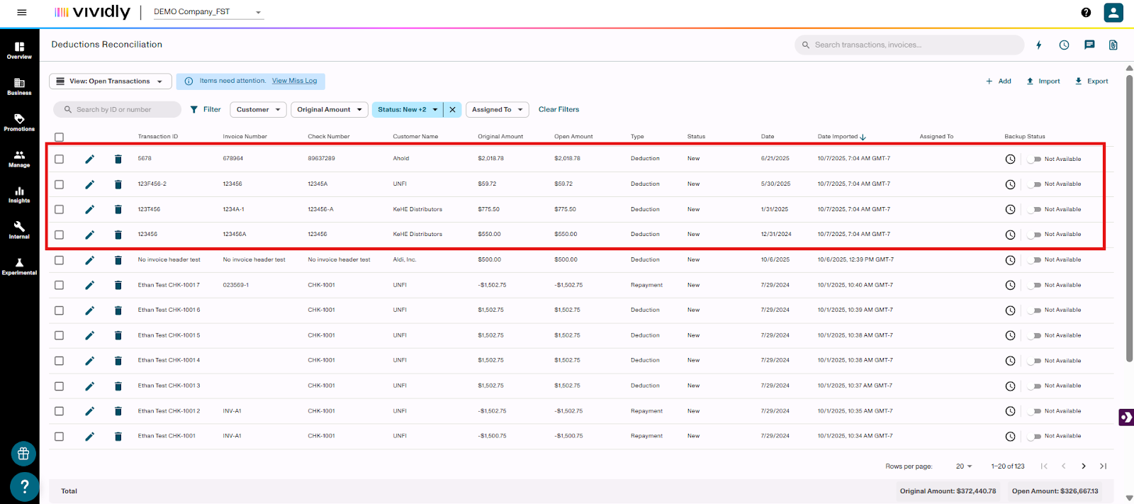 The uploaded deductions will appear in "New" status and be ready for processing and matching with backup documentation.