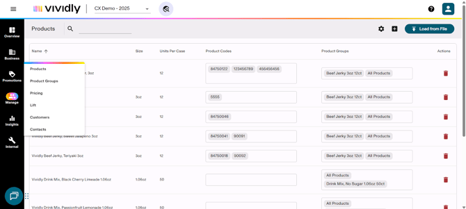The Manage section of Vividly that serves as a central hub to manage foundational elements that drive promotions, forecasting and deduction processing. This section subdivides in several pages: