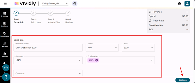On Step 1, you can modify basic promotion identifiers: Promotion Name, Month & Year, Customer, and First Receiver.