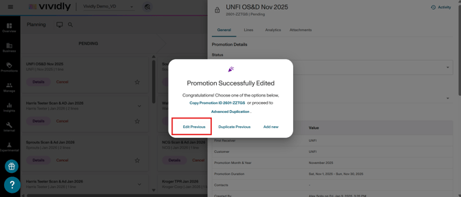 To access, navigate to Promotions > Planning and click on your promotion. Open the Promotion Profile by clicking "Details," and then clicking the Master Edit button located at the bottom of the General Info tab. Users can also access Master Edit immediately after creating a promotion through the "Edit Previous" button that appears in the post-creation dialog.