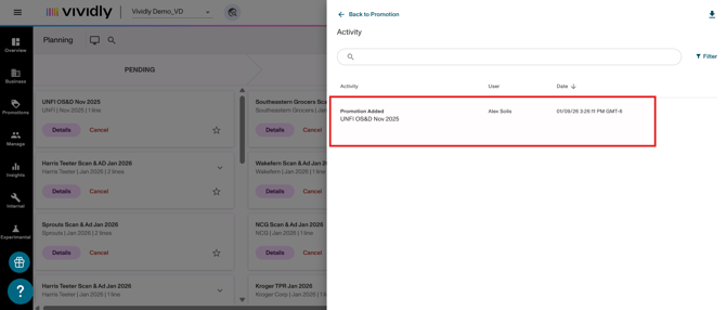 To view the full audit trail, click the Activity Log button at the right-upper corner of the promotion profile to see all changes made to the promotion, including what was changed, by whom, and when.