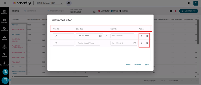 Plus icon: Adds new pricing timeframe for the customer-product group combination.