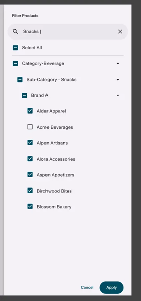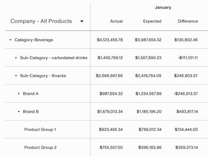 - Support for hierarchical filtering and viewing, allowing you to filter and view by customer or product hierarchy levels. (Note: To enable hierarchies, please contact your CSM.)