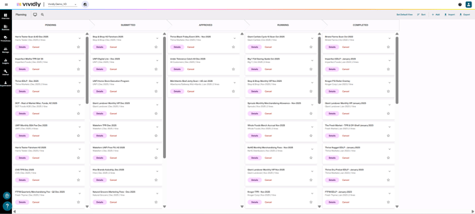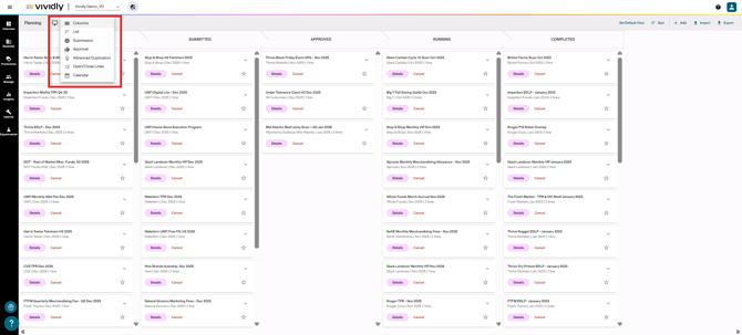 - Columns: Default landing view that organizes promotions into vertical columns based on their status (Pending, Submitted, Approved, Running, Completed), enabling visual workflow management and drag-and-drop status changes.