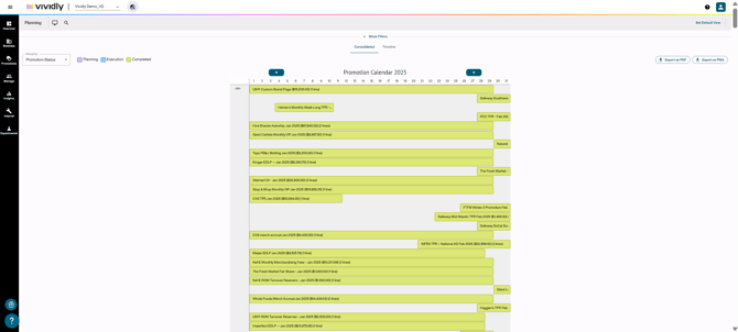- Calendar: Visual promotional calendar interface that displays promotions by month or year with color-coded status indicators, filterable by customer/product/promotion type, and exportable as PDF/PNG.